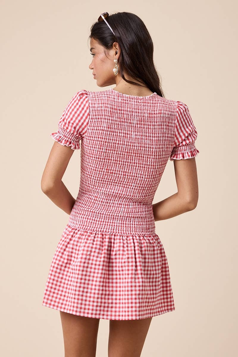 Plaid Print Crew Neck Short Puff Sleeve Smocked Torso Fit & Flare Mini Dress SELF:100%COTTON * Model Info: Height 5'8'' / 176 cm Bust 32BB Waist 22'' / 55 cm Hips 34.5'' / 88 cm