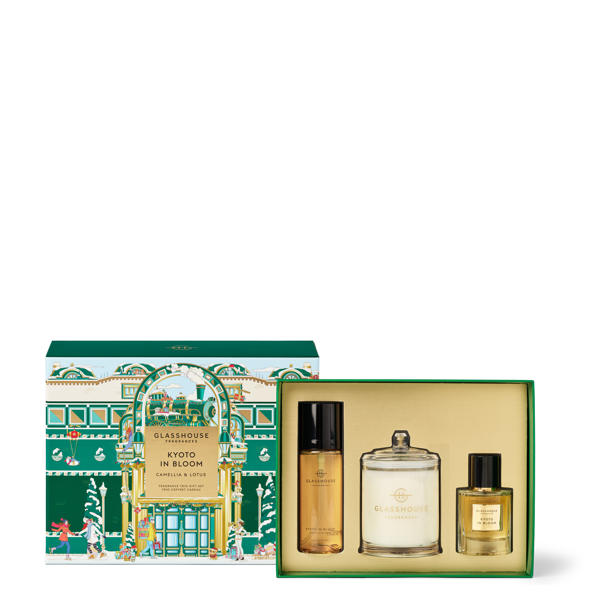 Fragrance Trio Gift Set. Give the gift of one glorious fragrance experienced in three ways - scenting the air, as fine fragrance, and wafting off skin and hair. Contains 1 x 1.7 fl. oz. Eau de Parfum, 1 x 7 oz. Candle, 1 x 3.4 fl. oz. Hair & Body Mist all wrapped up in a festive Gift Box with illustrations by Aeoniumsky.