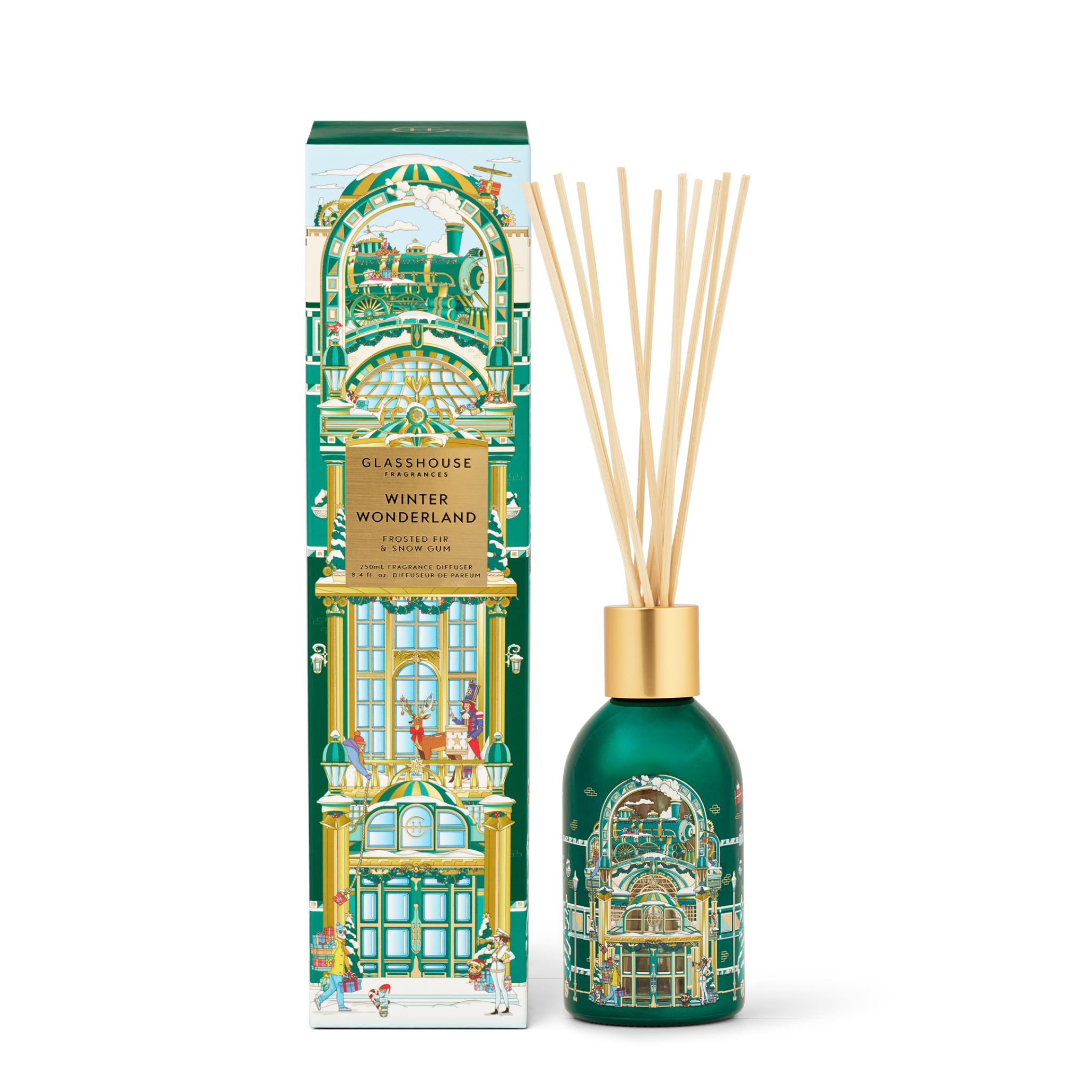 8.4 fl. oz Fragrance Diffuser. The nostalgic, sensory immediacy of the tree, glistening prettily with snowflakes and sparkling with the scent of freshly cut Fir and Spruce. In a decorative vessel with illustrations by Aeoniumsky, that brings the magic of the festive season.